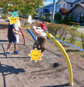 鉄棒を見つけて逆上がりや足かけまわりをしていました👏